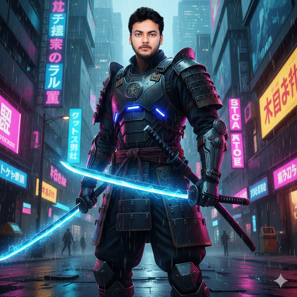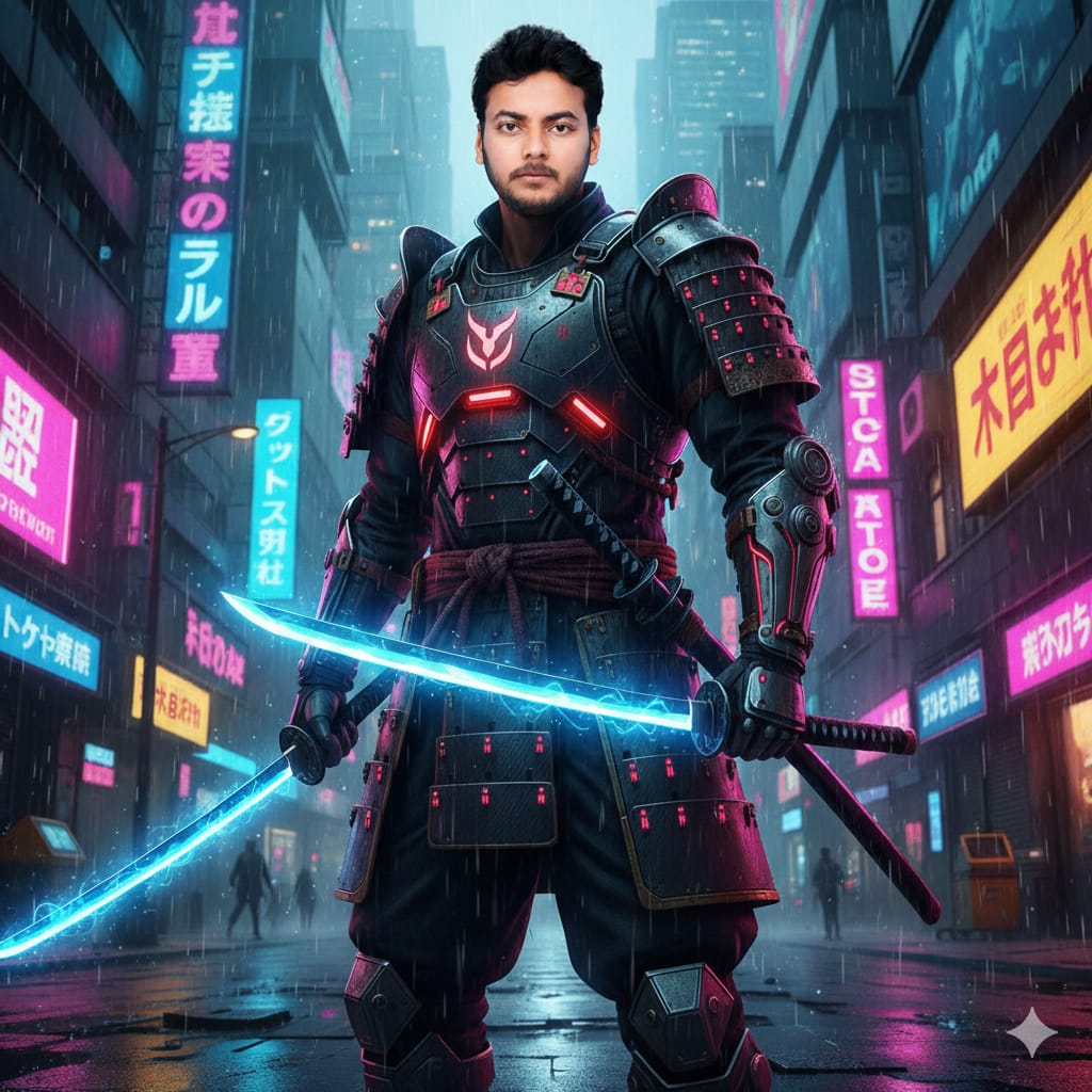 Ultra-realistic portrait of a futuristic samurai standing under Tokyo neon lights, rain reflections on the ground, cinematic lighting, detailed armor, glowing katana, 8K UHD, masterpiece, digital art style. Face shouldย beย 100%ย match.